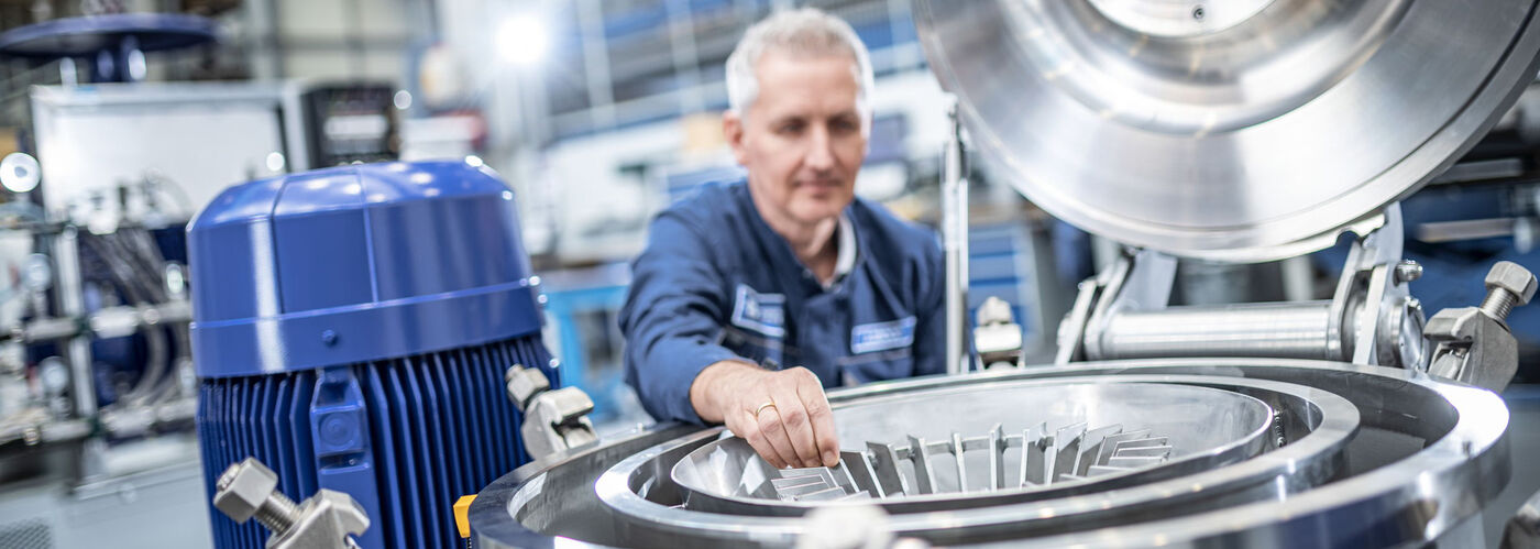 The machine is characterised by its integrated dynamic classifier. The product-air mixture rectified by the guide vanes is fed evenly to the rotating classifier. In the classifying area, separation into coarse and fine material takes place due to two opposing forces and the different mass of the particles. The coarse product is rejected by the classifier wheel, returned to the grinding zone and is ground again. The fine product passes through the classifier wheel and exits the grinding chamber. The separation limit is set via the speed of the classifier wheel and can also be infinitely adjusted during grinding operation.