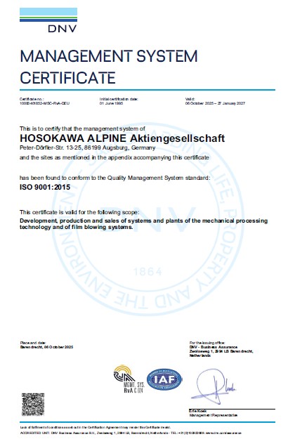 Hosokawa Alpine is certified to comply with ISO 9001:2015. Our machines and systems comply with the applicable ATEX directives. You can find our current IECEx certificates for explosion protection at www.iecex-certs.com