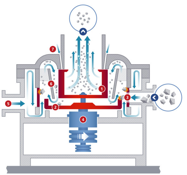 Powietrze, doprowadzane od dołu, transportuje rozdrobniony materiał do koła separującego po zmianie kierunku na pokrywie młyna. Powoduje to separację cząstek w zależności od ich wielkości. Tylko te cząstki, które osiągnęły pożądany stopień rozdrobnienia, przejdą przez koło separujące i opuszczą maszynę jako gotowy produkt. Większe cząstki są odrzucane przez koło separujące i trafiają z powrotem do strefy mielenia. Ten cykl mielenia i separacji jest kontynuowany do momentu, aż wprowadzony materiał osiągnie pożądany stopień rozdrobnienia.